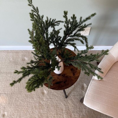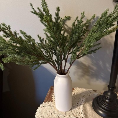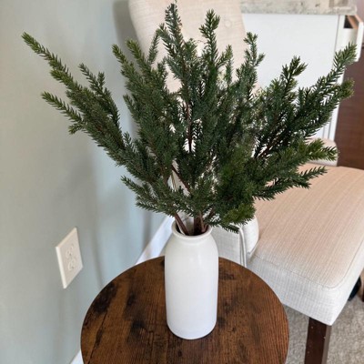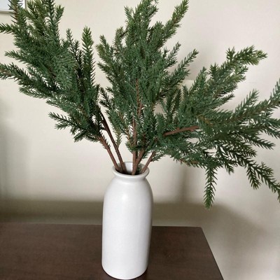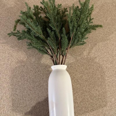 [This review was collected as part of a promotion.] I would highly recommend this pine arrangement for your holiday decor or anytime. It is simple and elegant with the white ceramic vase and the green pine is a wonderful eye catching color. Love the fact that is low maintenance meaning it does not any care as far as watering and no shedding needles. They branches are easy to move and design how you would like in your home.