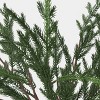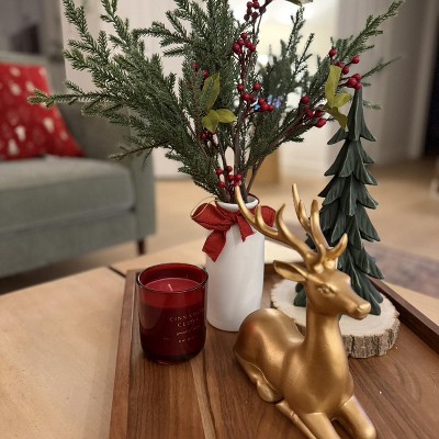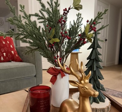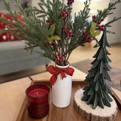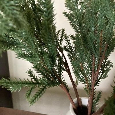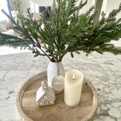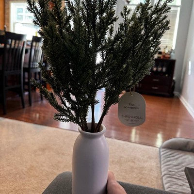 Bring holiday vibes to your Christmas setup with this Draping Pine Arrangement from Threshold™. This arrangement features faux pine needles in a green hue for festive charm. Housed in a white ceramic vase with styrofoam filler, this arrangement brings a nature-inspired look to the space. Suitable for indoor use, you can place it on a tabletop or any flat surface for an inviting ambiance.