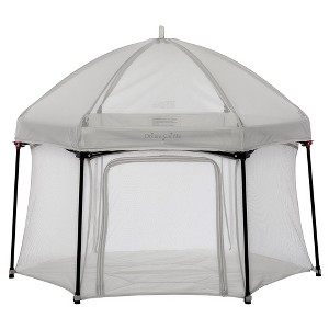 Surrounding clear mesh walls on all sides create a breathable, ventilated environment and allow you to monitor your child from any angle. A soft padded floor provides extra comfort for playtime or naptime. When you step outdoors, the removable canopy helps shield your baby from harsh sunlight, blocking approximately 98% of UVA and UVB rays.