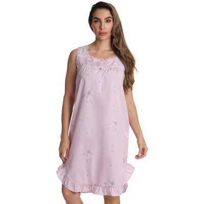 SLEEP TIGHT WITH THIS CUTE AND COMFY NIGHTY Beautiful Touch Slip into bed with a smile on your face! This is more than just a nightie, its a way to brighten up any evening and end every day on a happy note. With its cute 3-button neck, pleated detail, pretty crochet trim, and lovely picot edge, this sleeveless nightgown makes sleeping or lounging a beautiful affair. Weve complemented all the little smile-sparking details with a floral pattern brought to life with a darling touch of color. Choose between lovely shades of mint, pink, aqua, and lilac and upgrade your nightwear with classic cuteness. Comfort Youll Relish Soft and breathable, this night gown treats you to all-night or all-day comfort. Weve designed it using 100% cotton knit into jersey fabric. The result? Sleepwear that keeps you comfortably cool during those warm nights, and loungewear that you wont want to slip out of. Comfort is nothing if it doesnt have the right fit to back it up. Thats why weve gone for a semi-loose fit that allows you to move without restrictions and designed the sleep dresses in a wide size range to suit just about any shape. Here are more reasons to love this sleep gown: - Handles well in the wash without losing its softness. - Available in S-3X to fit the petite to the plus sized. - Made with great attention to detail for a lovely finish. - Comes in multiple color options to suit any taste. - Doubles as comfy loungewear youll love to rock. Upgrade your nightwear with a 100% cotton sleep gown thats all about 100% comfort!