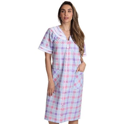 • DESIGNED FOR COMFORT: Slipping into this seersucker housecoat robe is an experience in pure comfort. Weve used a breathable mix of 55% cotton and 45% polyester to design these house robes for women, and given them an easy fit zipper snap closure for stress-free wear.