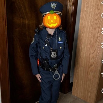 Impressed with the quality of this police officer costume. Sturdy hat, good patches, and realstic handcuffs. Slightly big but can reuse. Missing gun. Great kids.
