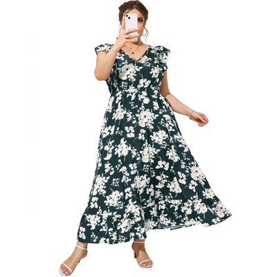 Dresses for Women Sleeveless Printed Cap Sleeves A Line High Waist Long Hem Trendy Maxi Dress,Dark green,XXL
