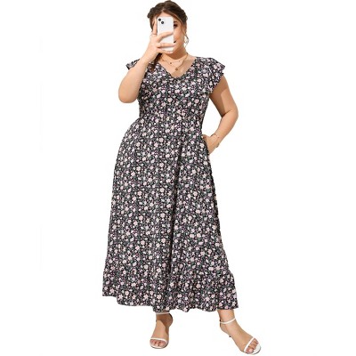 Dresses for Women Sleeveless Printed Cap Sleeves A Line High Waist Long Hem Trendy Maxi Dress,Black,S