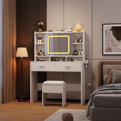 - Ultimate Organization & Smart Charging - Maximize your space effortlessly! This vanity table with mirror boasts a spacious desktop, 3 smooth-gliding drawers, multiple open shelves, and a dedicated hair dryer holder. Neatly store and stylishly display all your essentials: cosmetics, perfumes, nail polish, hair tools, and accessories. Plus, stay powered up: the integrated charging station includes 2 standard AC outlets and 2 USB ports for all your devices and beauty tech. Everything has its place!