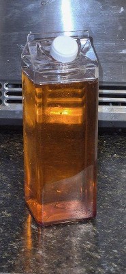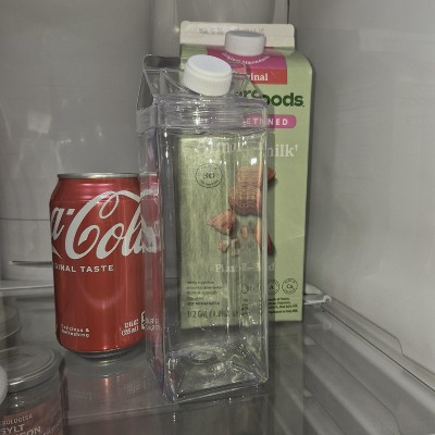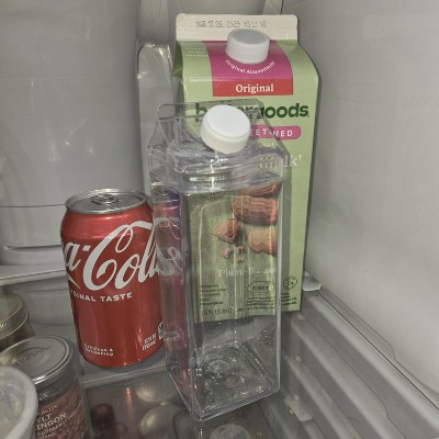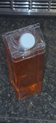 This cute little plastic carton/bottle/carafe holds just over two cups of liquid. It's not too difficult to clean because of the removable top, in addition to the spout lid. The plastic is thick and seems pretty durable.