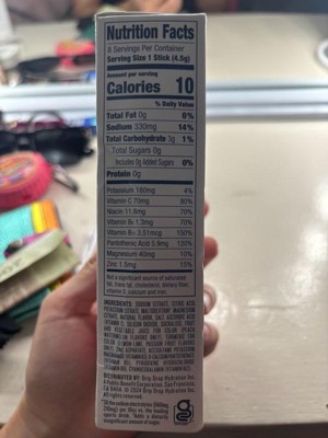 passion fruit - sodium citrate, citric acid, potassium citrate, maltodextrin+, magnesium citrate, natural flavor, salt, ascorbic acid (vitamin c), silicon dioxide, sucralose, fruit and vegetable juice for color (peach, watermelon flavors only), turmeric for color (lemon-lime, passion fruit flavors only), zinc aspartate, acesulfame potassium, niacinamide (vitamin b3), d-calcium pantothenate (vitamin b5), pyridoxine hydrochloride vitamin b6), cyanocobalamin (vitamin b12)., peach - sodium citrate, citric acid, potassium citrate, maltodextrin+, magnesium citrate, natural flavor, salt, ascorbic acid (vitamin c), silicon dioxide, sucralose, fruit and vegetable juice for color (peach, watermelon flavors only), turmeric for color (lemon-lime, passion fruit flavors only), zinc aspartate, acesulfame potassium, niacinamide (vitamin b3), d-calcium pantothenate (vitamin b5), pyridoxine hydrochloride (vitamin b6), cyanocobalamin (vitamin b12), lemon lime - sodium citrate, citric acid, potassium citrate, maltodextrin+, magnesium citrate, natural flavor, salt, ascorbic acid (vitamin c), silicon dioxide, sucralose, fruit and vegetable juice for color (peach, watermelon flavors only), turmeric for color (lemon-lime, passion fruit flavors only), zinc aspartate, acesulfame potassium, niacinamide (vitamin b3), d-calcium pantothenate (vitamin b5), pyridoxine hydrochloride (vitamin b6), cyanocobalamin (vitamin b12), watermelon - sodium citrate, citric acid, potassium citrate, maltodextrin+, magnesium citrate, natural flavor, salt, ascorbic acid (vitamin c), silicon dioxide, sucralose, fruit and vegetable juice for color (peach, watermelon flavors only), turmeric for color (lemon-lime, passion fruit flavors only), zinc aspartate, acesulfame potassium, niacinamide (vitamin b3), d-calcium pantothenate (vitamin b5), pyridoxine hydrochloride (vitamin b6), cyanocobalamin (vitamin b12)