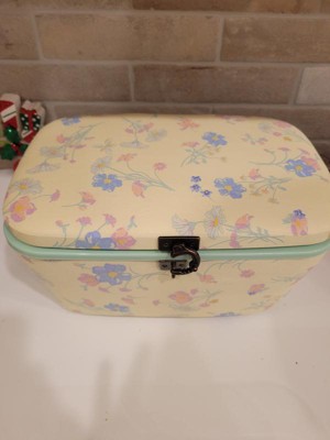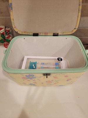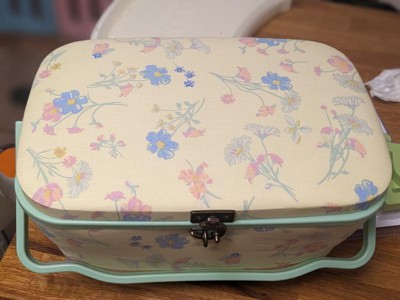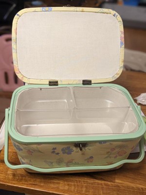 [This review was collected as part of a promotion.] The print on this basket is so pretty, very nice yellow with pretty light pastel flowers printed on it. It's a great size big enough to fit quite a bit of stuff but also has removable clear dividers to keep things separated. Nice sturdy outside and soft top , overall really love this sewing basket and having a place to store all my sewing items is super helpful.