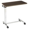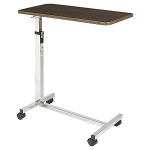 The walnut, wood grain low-pressure laminate top on this deluxe tilt-top table by Drive Medical tilts 33 degrees in either direction, giving you the ability to adjust it to suit your needs. With the slightest upward pressure, the table can be raised or lowered in infinite settings between 26.5"-46", and the top locks securely when the height adjustment handle is released. Chrome-plated steel "H" base provides added stability and security and lead to swivel casters, which allow for maneuverability.