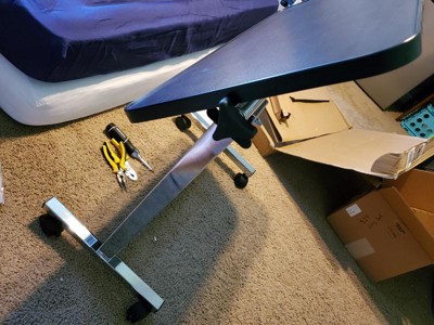 It showed up earlier than expected, but it had noticable cosmetic damage to the table top -- the brown woodgrain finish was chipped and the particle board underneath showed through in two spots. Nbd, but annoying. However, when I put the thing together, it felt flimsy, and when I was done, the top is so easy to tilt that any load more than 5 pounds would be dumped to the floor! I've tightened every joint and hinge, but the top is just really loose for some reason. I'm not sure if mine was defective or it's a design flaw, but I'm definitely returning it.