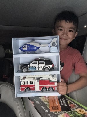 - Comes with fire truck, police SUV, and helicopter