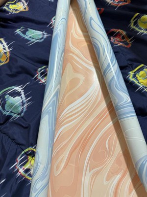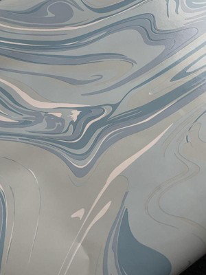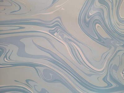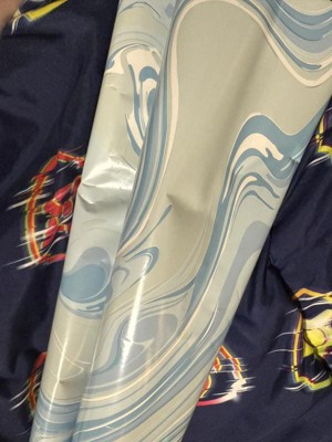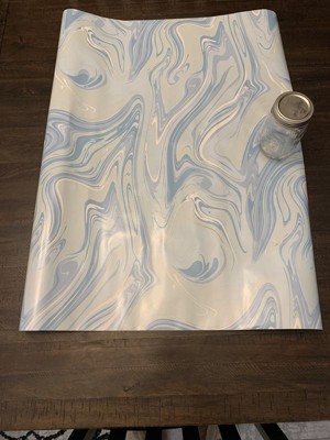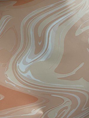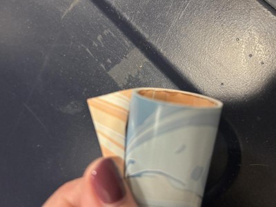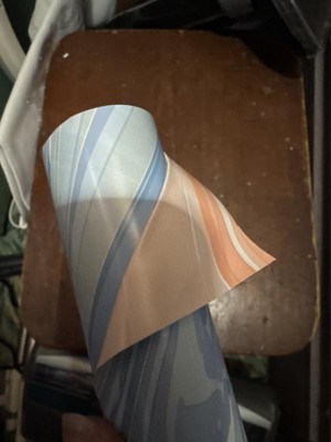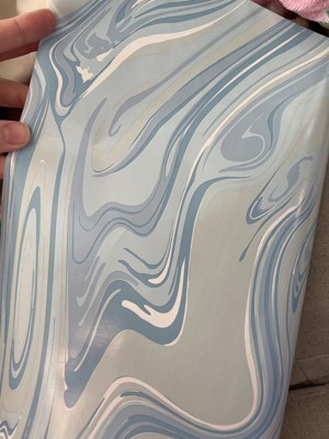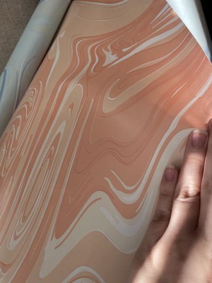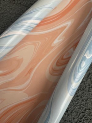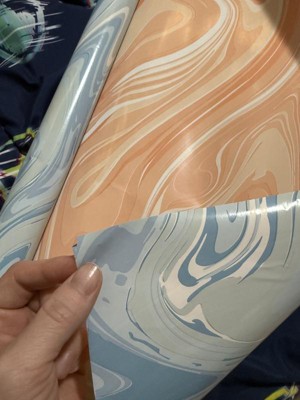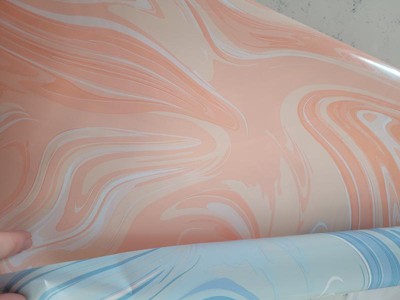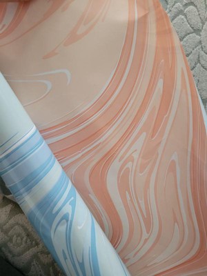 A: The wrapping paper features a marble pattern with blue and peach color options.