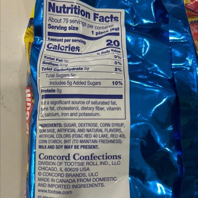 sugar, dextrose, corn syrup, gum base, artificial flavors, artificial color (fd&c red 3), corn starch, bht (to maintain freshness)' '