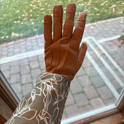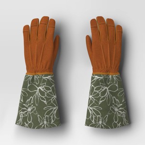 These Duck Canvas Scribble Floral Rose Picker Gloves from Threshold™ are an ideal choice for outdoor chores. These textured gardening gloves are crafted with brown faux-leather hands, paired with green flared cuffs showcasing a white scribble floral print for playful contrast. The rose picker gloves feature cinched wrists for a secure fit, helping to keep your hands clean and protected while pruning, planting and digging in the garden or backyard.