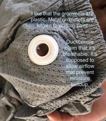 [This review was collected as part of a promotion.] I have a 2018 Toyota Rav4 and this is a very close fit. Loose enough to allow proper airflow, but tight enough to be secure. I was initially confused as to which way this was supposed to go on but I found out that brand logo Duckcover is supposed to sit at the back of the SUV. I like that used plastic instead of metal grommets. It's supposedly made of breathable material which is supposed to allow airflow that would prevent moisture buildup and mildew. While it has a lot of features that is designed to minimize the risk of scratching, it still falls short in some areas. It lacks a soft inner lining or padding that is supposed to prevent scratching. While the material seems durable and tear resistant, it's not particularly soft. It makes a crunchy sound similar to a plastic wrapper when you move it. The recommended materials is cotton or some sort of fleece. Since the cover isn't padded, it's probably not enough to protect from falling objects like hail or branches, although it might be thick enough to be a buffer for small hail. It seems like it mainly protects it from UV rays and bird droppings. Because the interior is not very soft, I only plan to use it for short intervals for when I'll be away on trips or for particularly bad weather. Overall, I would say this is a good quality cover for outdoor, but I would prefer it had a soft inner lining.