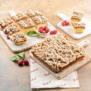 Our crumb cakes are moist, delicious, and filled with a bursting raspberry flavor. The middle parts melt in your mouth and the crumbly topping adds a creamy and crispy texture to your eating adventure, indulge!
