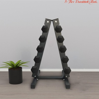 • Adjustable Tier Spacing: 5-tier dumbbell rack stand with customized spacing (3.5"-6.5") accommodates all dumbbell sizes. Integrated slotted rubber padding protects equipment finishes, while floor-friendly base guards prevent scratches.