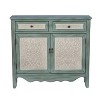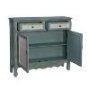 A: The Duncan Cabinet Console Table is an antique blue not a teal. It is a light shade of blue with white door and drawer fronts.