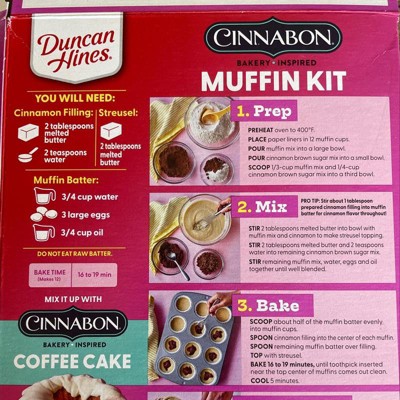 Start your day off right by filling your kitchen with the mouthwatering cinnamon aroma of Duncan Hines Cinnabon Bakery Inspired Muffin Kit. This baking kit is easy-to-follow and includes muffin mix, Cinnabon cinnamon brown sugar mix, and cream cheese flavored icing. Combine all together to create an irresistible treat that's perfect for breakfast or any time of the day! Fall in love with gooey warm cinnamon sugar filling all inside a fluffy, delicious muffin and topped with a sweet cream cheese icing and cinnamon brown sugar streusel. You no longer need a special occasion to make life's moments sweeter with Duncan Hines desserts and baking mixes. Pick one up today and create something amazing.