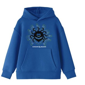 Fill out character sheets and get ready for game night with this Dungeons & Dragons sweatshirt. The hoodie features a round black creature with a large eye and mouth and ten eyestalks White and green line art behind the Beholder copies the monster's outline. The sweatshirt comes in royal blue with a double-lined hood and a large pouch pocket. This hoodie makes a great gift for young D&D players.