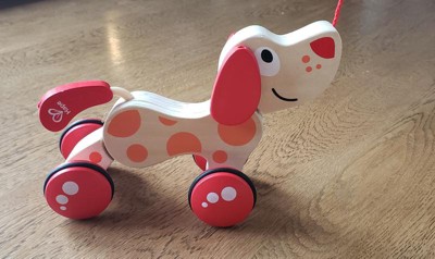 HAPE WALK-A-LONG PEPE PUPPY - RED & ORANGE - This push toy is perfect for your baby as they grow and become a toddler. This friendly puppy can accompany your baby crawling as they push the puppy across the floor or once they start walking, it can be the perfect walk-a-long puppy as it is ready to be pulled anytime. Features Pepe the Puppy in a fun pull-along style toy. Natural wood design with bright simple colors. Cheerful and ready to adventure with you! Encourages kids to imagine and create stories as they play. AWARD-WINNING: This playful wooden puppy is a winner of the 2012 Parents’ Magazine Best Toys Award.