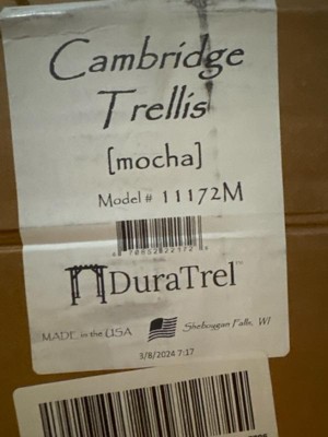 [This review was collected as part of a promotion.] The Dura -Trel Cambridge Outdoor Trellis came in a long tall skinny box with a lot of pieces. I am not great at assembling things by myself so this was a pain to put together. It took longer than I would have liked. But I am satisfied with the product and it feels like it will hold up under the weather. My ivy will look good growing on it.