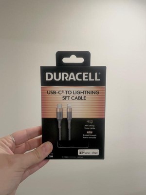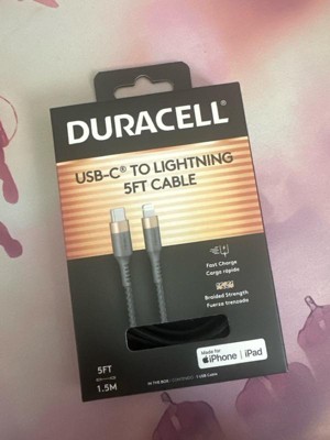 Recharge or sync your Apple Lightning devices with the MFi-certified Duracell Premium 5 ft. USB-C to Lightning Cabledesigned for fast, reliable power from The Most Trusted Brand In Power. This high-quality cable features durable connectors compatible with iPhone, iPad, iPod, and AirPods. With a generous 5 ft. (60 in.) reach, its perfect for charging from a USB-C power adapter or transferring photos, music, and data via your computers USB-C port. Built to last, its double-braided nylon outer jacket and reinforced stress points help it withstand twists, tangles, and daily use without fraying. Keep your essential devices powered up and ready when it matters most.Whats in the Box: