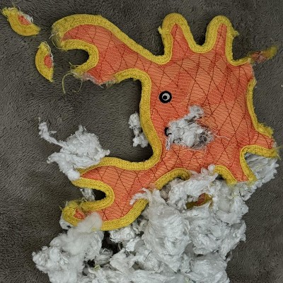 This toy is truly a TOUGH toy to destroy. My Great Pyrenees puppy has gone through so many toys claiming to be ‘tough’, but due to the shape and having such a strong seam, it barely has any damage. We have had this toy for three months now when he can typically destroy something within a few days. 10 out of 10. Would buy again. Highly recommend for an aggressive chewer.