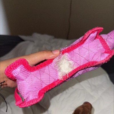 terrible toy for a tough chewer! 21.99 in the trash bin in under an hour. Save your money and get something that is not made of cloth. Note that there WAS NOT any squeaker.