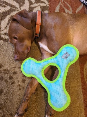 The Duraforce TriangleRing is a colorful dog toy that's perfect for a game of fetch and tug with your pup! Duraforce toys are engineered for strength and durability. Each toy is made from plastic-coated polyester fibers that are woven into a thick mat. Each edge is protected by industrial grade webbing. The Duraforce TriangleRing features three squeakers, each sewn inside protective pouches, for your dog's safety and to provide hours of fun and entertainment. Our toys are built to last, but keep in mind that no toy is "indestructible". Duraforce dog toys are designed for interactive play - not as chew toys. Machine wash / air dry.