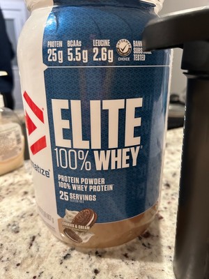 - Dymatize Elite 100% Whey is a scientifically formulated blend of whey protein concentrate, whey protein isolate and whey peptides. Each fast-digesting and absorbing serving has 25 grams of high-quality whey protein to support muscle growth and recovery goals after workouts or between meals. It’s easy-to-mix and delicious, making it ideal for use in baking and cooking.