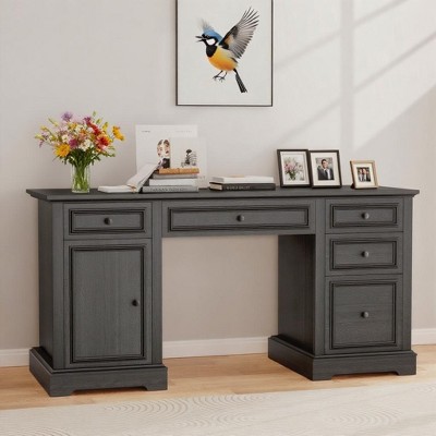 Large-capacity executive desk: Our office desk enlarges the desktop, measuring 60 inches in length. It features 5 drawers and storage cabinets of different sizes, allowing you to easily place your computer, books, keyboard, accessories, etc., providing you with a spacious and comfortable user experience and keeping you away from a messy and crowded workspace. Easy to organize and sort: Three small top drawers are convenient for storing frequently used items. The long drawer is for keyboards, photo albums and other long items. The large bottom drawer is for A4-sized items. The hanging design enables quick access. The height-adjustable storage cabinet can store larger items such as backpacks, boxes and gift boxes. Meet all your needs. Classic and elegant design: Utilizing natural wood grain, the drawer door frame is adorned with relief designs, giving this modern home table a unique style and atmosphere. Three colors offer you more choices for your personal style, and the classic retro white adds literary elegance to your house.