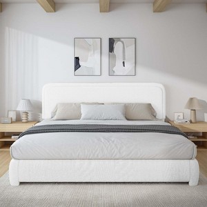 - The platform bed frame is upholstered in a cloud-like terry fabric and premium foam fillings, which are soft to the touch and provide better back support. Modern boucle bed frame fills your home with warmth and calm. Featuring a simple stylish curve-shaped and line design on the headboard and footboard, the upholstered bed frame reduces injuries caused by everyday bumps and is suitable for kids and adults. This cloud bed frame is constructed with sturdy legs, a support metal frame, and solid wood slats, greatly enhancing the sturdy stability of the bed, equipped with quiet foam that is designed for noise-free sleep. The headboard of the cream bed frame has 3 height levels which can accommodate 8-12 inches thick mattresses. Soft boucle fabric adds a touch of warmth to your bedroom, lying on the bed like sleeping on a soft bed frame. Velcro connects the slats for easy assembly and reduces any noise. We have the necessary assembly tools and clear assembly instructions, making the installation of the bed frame with adjustable headboard faster.