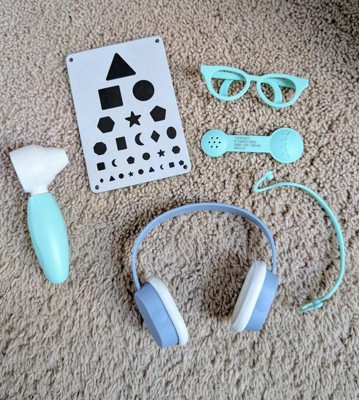Inspire your little one to use their imagination for hours of fun playtime with this Ear & Eye Check-Up Play Set from Gigglescape™. The play set includes a otoscope, glasses, eye exam paddle, headphones, paper eye chart and pair of hearing aids to encourage hours of caregiver and patient play. Made with plastic pieces, the play set is great for mental development and is recommended for ages two and up.