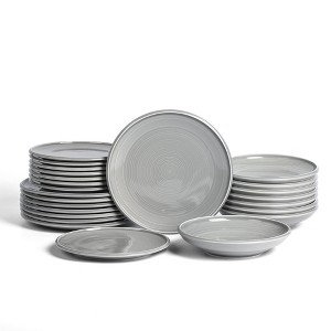 The Earth & Clay Harmony Stoneware 24-Piece Dinnerware Set balances style and practicality. Mimicking the natural beauty of hand-thrown pottery through a subtle spiralled center, you'll notice slight variations from one piece to the next. Complete with raised rims and a glossy durable finish, this collection comes available in three earthy tones, and includes 8 10" dinner plates, 8 8.5" salad plates, and 8 8.5" pasta bowls.