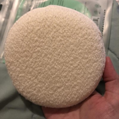 Got this when it had zero reviews. I thought it would be like those reusable little cotton rounds that are basically flat. It's actually a bit spongy inside and much bigger than expected. And, as it says it's cotton, I didn't expect it to have what seem like plastic little loops all over the exfoliation side. The opposite side has a fabric handle type loop across it and the fabric on that side is softer. The handle can be flipped around so that the soft side is on your face, but then your hand is against the rough side and that feels weird.