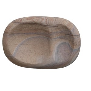 - An oval sandstone dish that captivates with its multi-colored hues and natural, earthy appeal