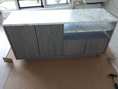 A: The area behind the large doors on the East Rock TV Credenza measure 27 3/4" wide, 17 1/8" deep, and 23 1/4" high. The area behind the small doors measure 25 7/8" wide, 17 1/8" deep, and 11 3/8" high.