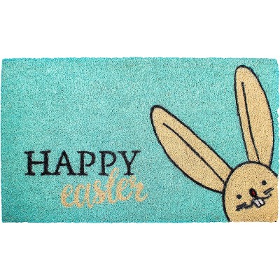 A: The doormat showcases an Easter checkered pattern in vibrant blue, pink, and yellow colors.