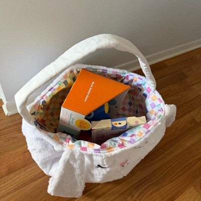 This Easter plush bunny basket was WAY BIGGER than I expected, despite being labeled as jumbo. I wouldn’t use this for gifts from the Easter bunny as its too large, but its fun to hold crafts and everyone’s activities throughout the holiday festivities. It also has a handle like a traditional Easter basket would.