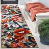 Crafted in India, a country renowned for its rich heritage in rug-making, this runner is made of high-quality polyester pile, offering durability, softness, and easy maintenance. The deep navy background creates a stunning canvas for the vibrant floral pattern that blooms in bold shades of red, accented with hints of green, white, and orange. The combination of colors ensures this piece will stand out and complement a variety of interior decors, from classic to contemporary.