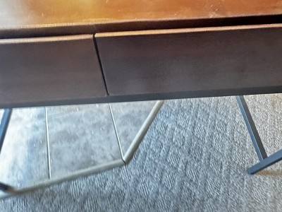 We just got this desk a week ago. It was pretty easy to put together- just attach the base pieces. It did have a chip in the black paint (base) and a few stain bubble blemishes on a drawer, but overall we are satisfied so far!!