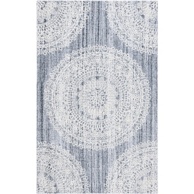 The rug features a sophisticated grey and ivory color palette that will complement a wide range of decor styles. The intricate floral pattern, inspired by nature's own artistry, adds a touch of serenity and class to your floors, as seen in the detailed image provided.