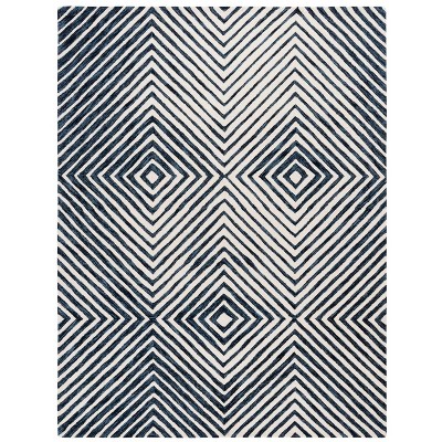 Elevate your living space with the timeless sophistication of our Hand Tufted Wool and Cotton Area Rug, sized at a versatile 5' X 8'. Crafted with meticulous care in India, this rug features a dynamic geometric pattern that combines the classic elegance of navy and ivory hues. The medium rectangle shape, with a comfortable pile height of 1/4", offers both luxury and practicality, making it an ideal choice for underfoot comfort in medium-sized rooms.