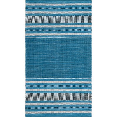 Infused with a tranquil palette of blue and grey, the rug showcases a subtle yet impactful pattern that will blend seamlessly into your decor. The pattern, discernible from the image, presents a harmonious blend of hues in a stripe-like design that exudes a sense of calm and order.