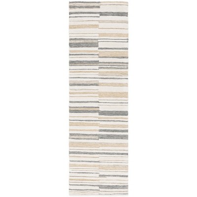 Measuring 2'-3" X 9' and boasting a comfortable height of 3/8", this rug is perfect for long hallways and intimate spaces, providing a soft, durable surface underfoot. The sophisticated palette of grey and ivory is gracefully outlined with a simple border, lending an understated elegance that complements a variety of interior designs.