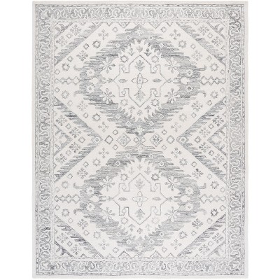 Transform your space with our elegant area rug. Measuring 8 feet by 10 feet and featuring a striking geometric pattern, this ivory and grey rug effortlessly complements contemporary decor. Crafted using a hand-tufted technique, it combines wool and cotton from India to offer a natural and appealing texture. The low pile height of 5/8 inch ensures a smooth and comfortable touch without compromising on style. Invite warmth and sophistication into your room with this large rectangular piece that blends modern design with traditional craftsmanship. Elevate your home with a timeless finishing touch that adds both visual interest and comfort.