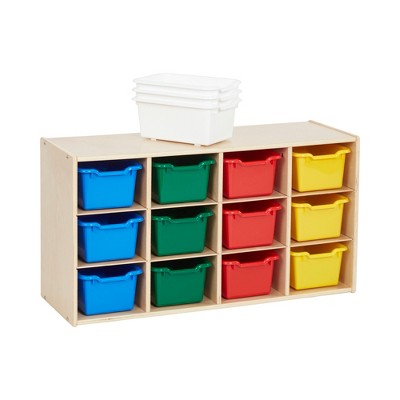 Keep your classroom or playroom uncluttered with the ECR4Kids 12 Cubby Mobile Tray Storage Cabinet with Scoop Front Storage Bins. Ideal for small spaces, kids can organize and store toys, games, building blocks, and school supplies that may otherwise be forgotten. Designed to grow with little ones, this storage cabinet with 15 bins helps parents, teachers, and educators keep small items within reach. Give children their own separate cubby at school to store art projects, homework, and personal belongings. Durable plastic bins feature rounded edges, an easy-to-grasp scoop front handle, and a curved interior to simply remove contents. Lightweight bins are easy to pick up and carry between activities. The low-profile open-face shelves encourage little ones to select their favorite activity independently, introduce organizational skills, and clean up when playtime is over. Four casters are included for mobility; move the storage unit from a hallway to the art room. Constructed from sustainably harvested birch plywood with a durable finish sealing the wood surface and resisting scratching. A UV inhibitor helps furniture resist ultraviolet light and yellowing. Birch plywood is extremely durable and will hold up to everyday use in an early childhood environment.