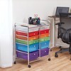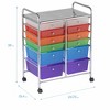 The multipurpose mobile rolling utility storage cart and organizer is perfect for the home, office, or school. 12 durable plastic drawers provide ample space to keep small items contained, off the floor, and within reach. Rainbow storage drawers slide on the metal channels allowing them to be removed. The translucent plastic design helps keep the contents discreet and private. Ideal for teachers to use for classroom organization, storing school supplies and homework; fits standard papers up to 9” x 12”. Sort and store scrapbooking materials, stickers, yarn, art, and small craft supplies in the art supply organizer drawers. Use as a makeup organizer to keep nail polish, hair tools, and makeup out of sight under a vanity. Keep office supplies organized under a desk with the 12 drawer rolling cart for added mobility. The desk organizer features four casters, two locking, allowing the 12 drawer cart to go where you need it most, and two easy-to-grab handles to easily push and pull. The durable frame is crafted from tubular, chrome-plated metal with a top shelf for additional space to display items. The teacher must haves versatility makes it equally useful in the laundry room, garage, office, bathroom, or kitchen.