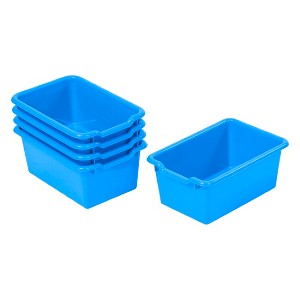 Keep your classroom and home organized, tidy, and efficient with ECR4Kids Scoop Front Storage Bins. The sturdy plastic bins are designed for everyday use to keep small items contained off the floor. Teachers, educators, and parents can utilize bins to store books, toys, manipulatives, and games. The open bin design displays and provides easy access to contents. Organize stories and label bins by reading level, theme, or holiday, encouraging children to independently select their favorite story and clean up during playtime. Personalize trays in classroom cubbies for children to store art projects, individual items, homework, and more. The Scoop Front Bins provide a flexible storage solution with endless possibilities for use from the garage to the kitchen pantry, or nursery. Durable plastic bins feature rounded edges, an easy-to-grasp scoop front handle, and a curved interior to simply remove contents. Lightweight bins are easy to pick up and carry, transporting from a storage cabinet to a play space. Bins nest to save space, and built-in stack supports prevent locking when empty. Use as standalone storage or pair with ECR4Kids storage lockers, cubby units, or tray cabinets; sold separately.